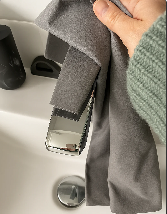 Meget absorberende, let at skylle af og vigtigst af alt efterlader den INGEN mærker. Jeg bruger den til spejle, vandhaner, vinduer... en sand fornøjelse. Min mand spurgte mig endda, hvor jeg havde fundet den!