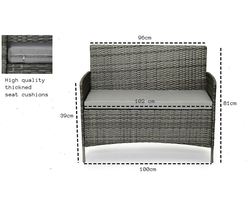 • Indhold: 1 bænk til to personer, 2 enkeltsæder, 1 sofabord og 3 sædehynder.
